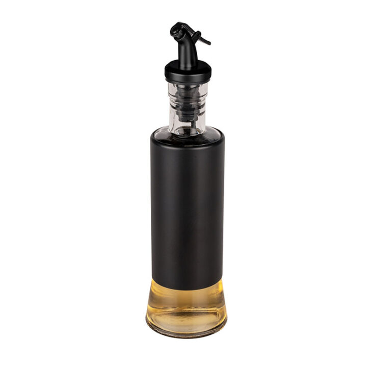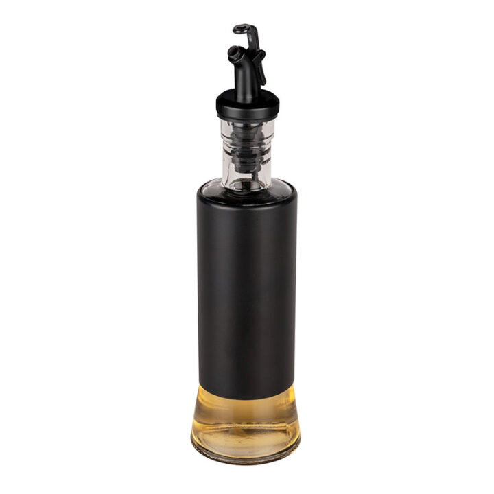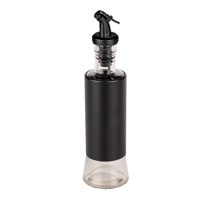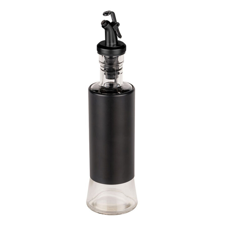 Esta dispensador de aceite o vinagre en spray está fabricado en vidrio con revestimiento en acero inoxidable y tapa de plástico. Es transparente y negro. Tiene una capacidad de 300 ml y unas medidas de ø 6 x h. 25 cm.