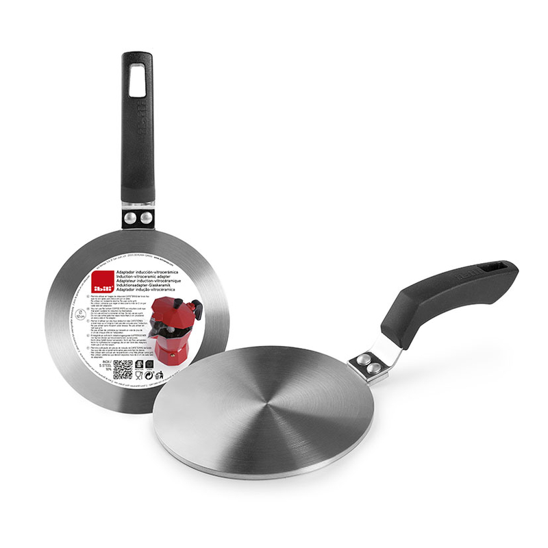 Este adaptador inducción para vitrocerámicas está fabricado en acero inoxidable y dispone de un mango en bakelita. Indicado para placas de inducción y vitrocerámica. Tiene un diámetro de 12 cm.
