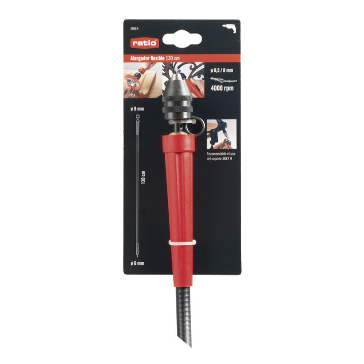 Eje flexible con portabrocas ø 0 5-8 mm con llave de pasador para ajuste, es el alargador natural del taladro. Indicado para taladros que trabajan a 4.000 rpm/máx La empuñadura está diseñada especialmente para mejorar la sujeción y agarre, muy adecuado en trabajos precisos y delicados.