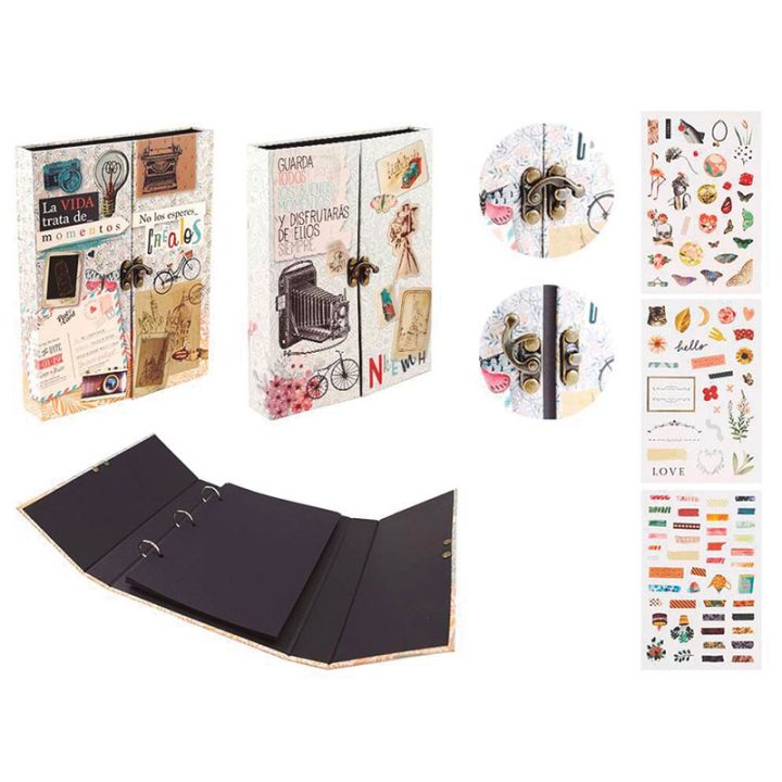 Este album de fotos tiene la tapa plegable con cierre metálico y hojas negras de 1890 gr. Además, incluye 3 hojas de pegatinas.También es una opción de regalo. Se sirve en 2 diseños surtidos.