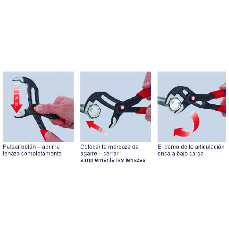 Este alicate dispone de un ajuste rápido especial para trabajos en zonas estrechas y de dificil acceso. Está diseñado para bombas de agua de alta tecnología. Podrás ajustar directamente en la pieza de trabajo simplemente deslizando el mango de los alicates. Está fabricado en acero al cromo vanadio eléctrico, forjado, multietapa endurecido al aceite. Los mangos son plastificados. El alicate tiene 250 mm de longitud, tiene una abertura para tubos de hasta ø 50 mm y para tuercas de hasta ø 46 mm. Viene presentado en una bolsa.