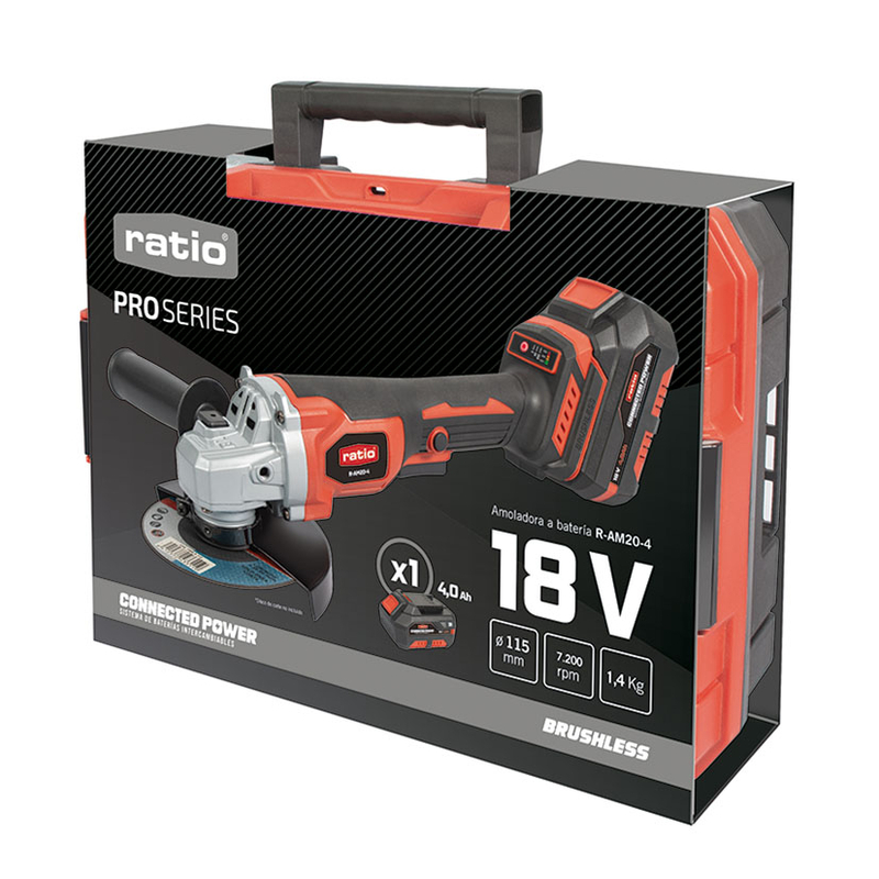 La amoladora angular RATIO ProSeries R-AM20-4 funciona con una batería de 18 V de potencia que proporciona 7200 rpm. Una máquina funcional e increíblemente práctica, con diseño compacto y ligero para un manejo seguro. Equipada por un potente motor BRUSHLESS(sin escobillas). Dispone de frenado eléctrico, para el disco en menos de 2 segundos. Con mango ajustable a ambos lados, agarre estrecho y ergonómico. Incluye batería 4.0 Ah, cargador rápido y maletín de transporte. Además, funciona con el sistema de baterías Connected Power para aquellos equipos de la misma línea.