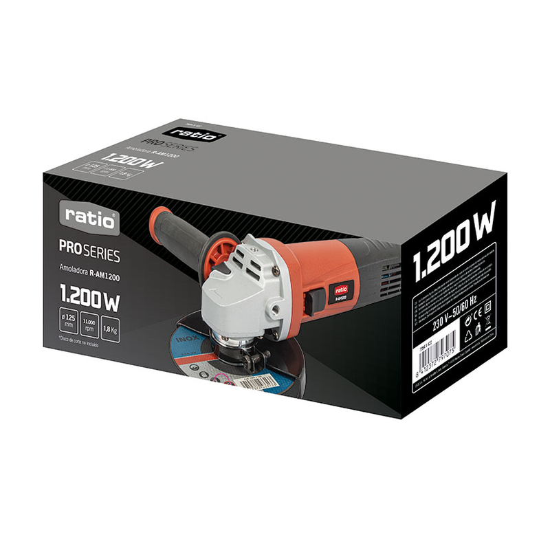 La amoladora eléctrica RATIO ProSeries R-AM1200, es funcional e increíblemente práctica, que te resultará imprescindible. Cuenta con un potente motor de 1200W, rodamientos con doble blindaje para una mayor durabilidad de la máquina, interruptor de seguridad, encendido y apagado lateral y una empuñadura auxiliar enroscable en 2 posiciones para mejorar las opciones de trabajo. No incluye disco de diamante. Viene presentada en una caja.