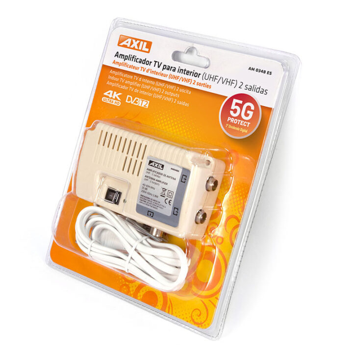 Está indicado para instalar en el interior de tu hogar. Tiene una ganancia de 25 db te ofrece 2 salidas para conectar 2 televisores e incorpora un filtro LTE/5G. Se presenta en doble blíster. Puedes consultar la información del producto consulando la ficha técnica que tenemos colgada en nuestra Web.