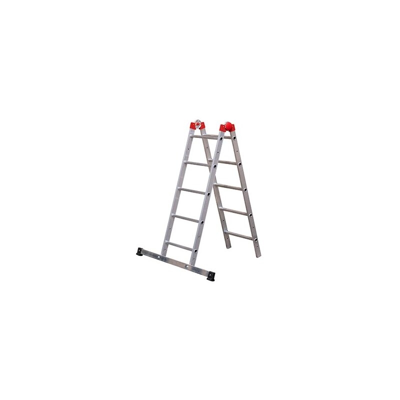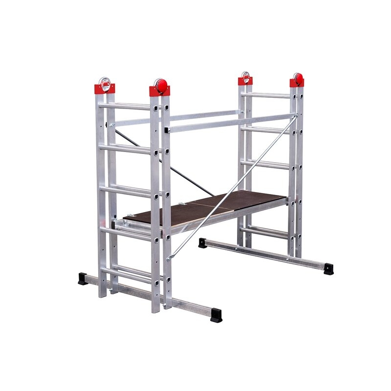 Plataforma de trabajo (Eurodeck) de madera (Pino Radiata Multistrato) reforzada por 2 estructuras de acero perfiladas en los extremos para un perfecto ajuste con el peldaño. 2 varillas de acero cruzadas. Kit de ruedas para montar en el soporte lateral a 2 mm del suelo para facilitar su desplazamiento.