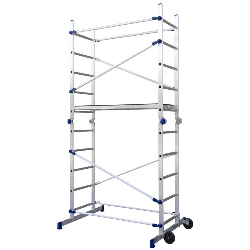 Construido con tubos de aluminio de 60×24 mm. y peldaños engastados con relieves antideslizantes. Articulaciones automáticas de fundición de aluminio. Montantes laterales con rápido sistema de posicionamiento. Plataforma de aluminio y tablero fenólico de 143×51 cm. Montaje muy rápido: 4, la segunda vez. Diseñado para soportar 150 kg