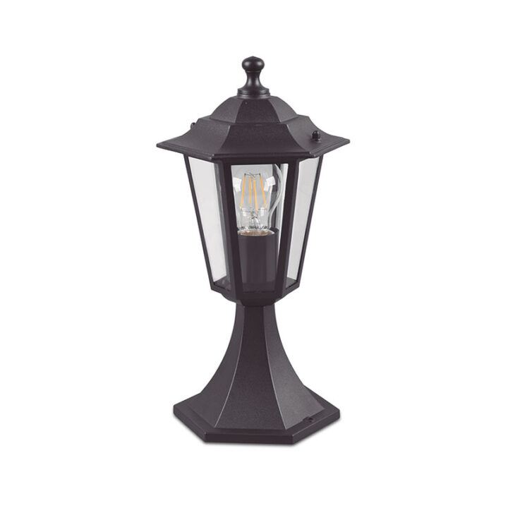 Este aplique tiene una estructura de aluminio fundido pintado en negro. Está diseñado para instalar en espacios exteriores. Tiene una impermeabilidad con protección IP44. El tipo de casquillo que necesita es de rosca E27 y una bombilla con una potencia de 60W de máximo que no está incluida. Este aplique tiene una altura de 37 cm. Se presenta en una caja.
