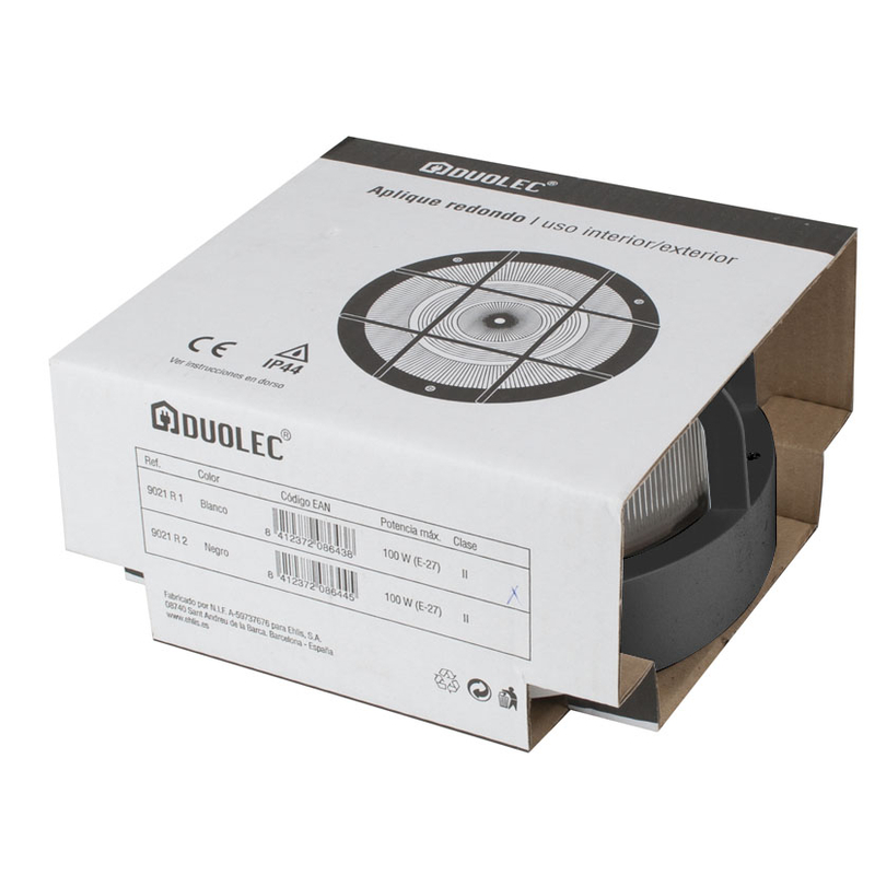 Este aplique redondo está formado por un difusor de vidrio y tiene una entrada de cable elástica. Funciona con una bombilla de rosca tipo E27. Su potencia máxima es de 60W. Tiene un grado de protección de IP44. Cumple con la norma CE EN 60598-1/2-1. Se presenta en una caja.