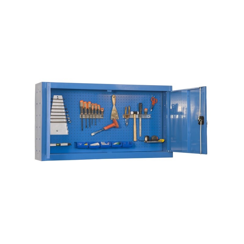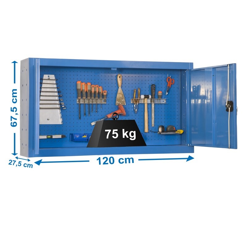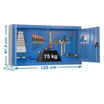 Armario metálico con cerradura para almacenar herramientas. Necesita anclaje a la pared. Dotado de un sistema de seguridad anti-volcado. Es de color AZUL y sus dimensiones son: 675x1200x200 mm. Tiene una capacidad de carga de 75 kgs. Es fabricado en España y se monta rápido siguiendo las instrucciones.