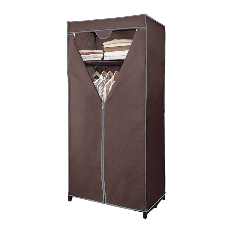 Este armario se desmonta con facilidad y está cubierto con un tejido sin tejer en color marrón con cierre de cremallera. El revestimiento de tela transpirable protege la ropa contra el polvo, la humedad y las polillas. La cremallera sirve para facilitar la apertura y el cierre. Además disponde de un estante para poder así economizar mejor el espacio. El rápido y simple montaje hacen de este armario una buena alternativa para poder guardar toda la ropa u objetos personales cuando no tienes más espacio. Tiene unas dimensiones de 75x50xh.160 cm. Viene presentado en una caja.