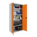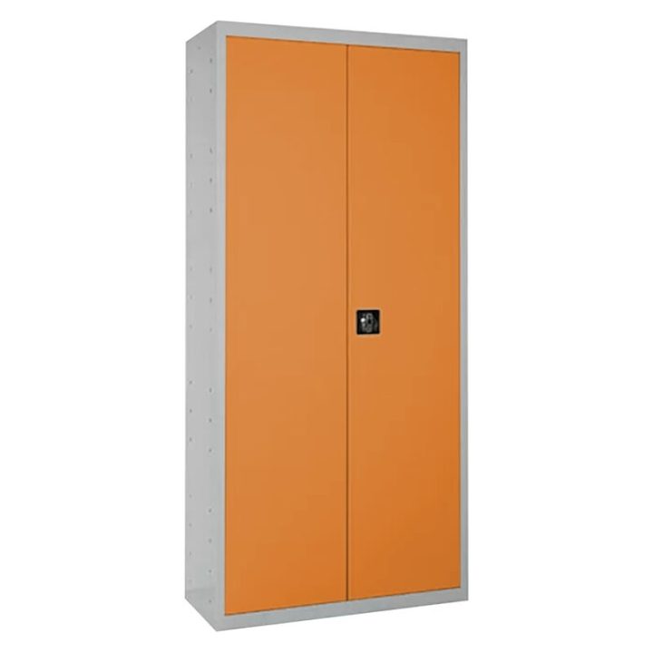 Armario metálico en gris y las puertas naranjas de 2 puertas y 4 estantes.