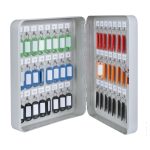 Este práctico armario de 240x80xh.300 mm está fabricado en acero pintado en color gris claro. Dispone de 48 colgadores numerados y 48 llaveros porta etiquetas para facilitar la indentificación de todas las llaves; así como los tornillos para su instalación. Se presenta en una caja.