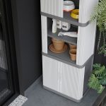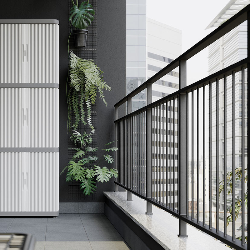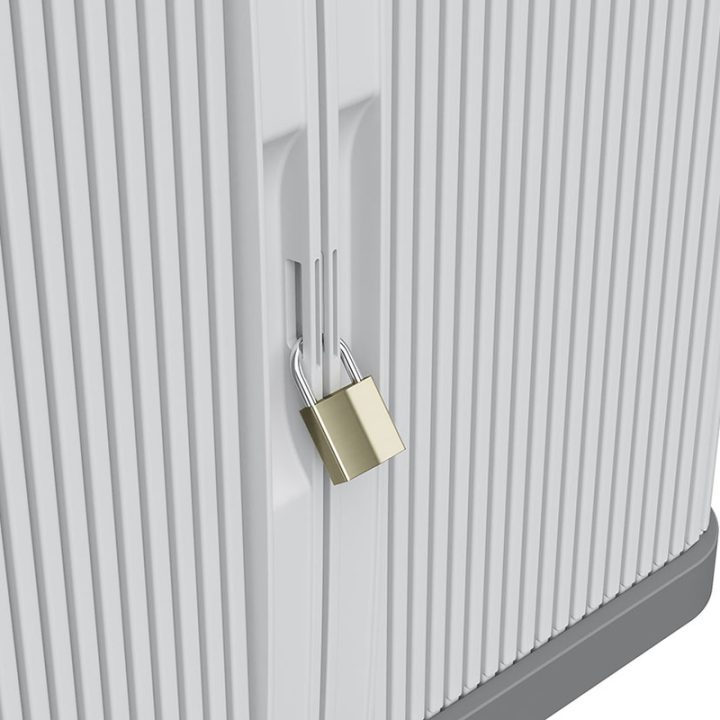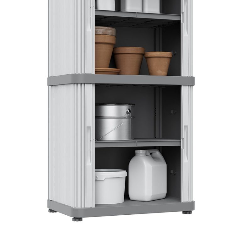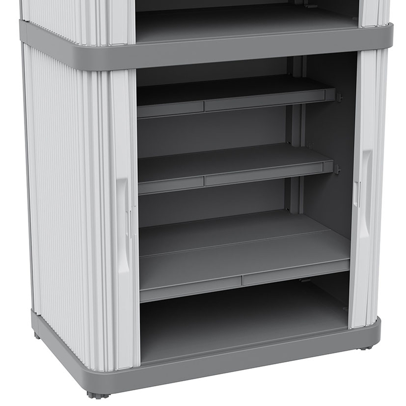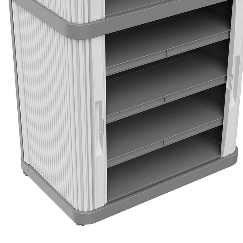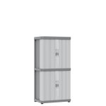 Armario multiusos de diseño robusto y resistente que puede ser ubicado tanto en interiores como en exteriores. Está fabricado en resina, un material plástico resistente a la intemperie, con protección contra la lluvia y certificado IP43. Está compuesto por 2 módulos, cada uno, dispone de puertas enrollables que permiten ahorrar espacio y 2 estantes que soportan una carga máxima de 10 Kg. Viene desmontado en una caja y tu mismo puedes realizar el montaje de forma sencilla. En nuestra web disponemos de diferentes modelos de armarios de esta misma serie.