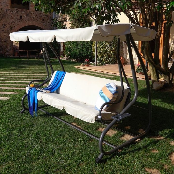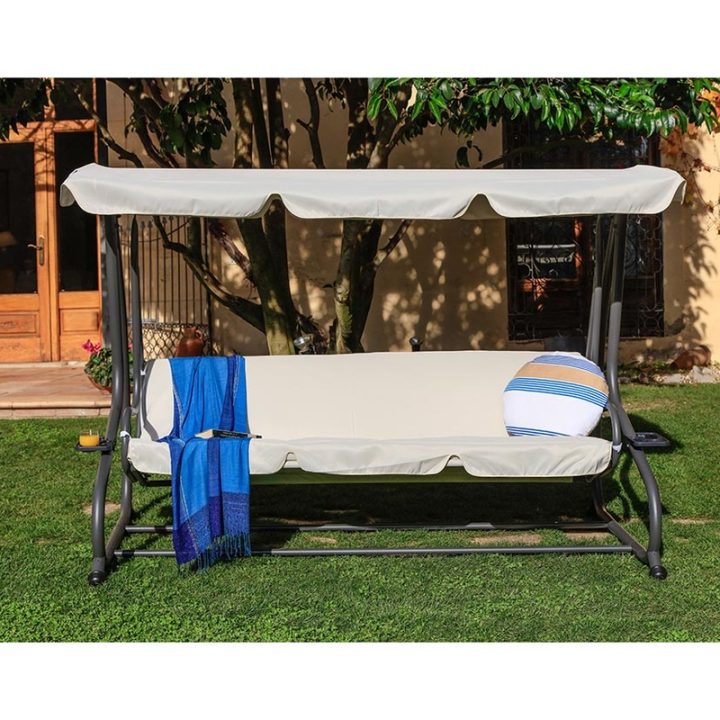 Este balancín viene equipado por una estructura tubular en acero de color gris antracita. Dispone de un asiento de tres plazas en poliéster y un toldo en poliéster 180 g/m, lo podrás convertir en una cómoda cama. Es ideal para pasar tus momentos de relax al aire libre con el máximo confort. Las dimensiones son 230×120 cm y una altura de 164 cm. Los colchones miden 190×48 cm tanto de asiento como de respaldo, son colchonetas doble. Este balancín tiene una carga máxima de 280 kilos, peso máximo repartido en 3 plazas son 93 kilos por plaza. Atención, este conjunto no viene montado y se sirve en 2 cajas.