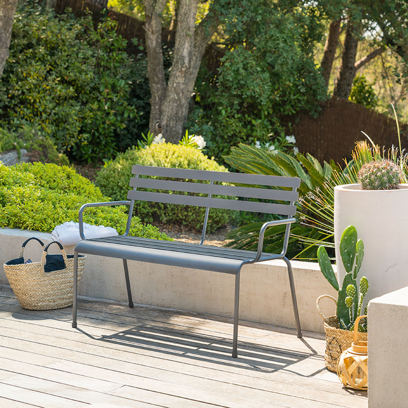 Este banco tiene la estrutura tratada con galvanoplastia anticorrosión, epoxi antioxidante y contra la antidecoloración. Combina un diseño elegante con un gran confort gracias a los reposabrazos que incorpora. Es perfecto para que puedas decorar el jardín, porche o terraza. El banco tiene unas dimensiones de 114×56 y una altura de 79 cm. Es apilable, fácil de almacenar para ahorrar espacio.