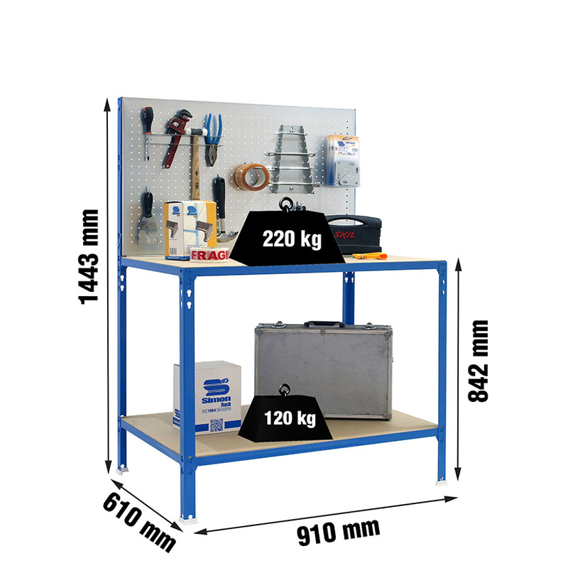 El banco de trabajo SIMONRACK EcoWork Click 900 está fabricado con materiales de alta calidad que garantizan durabilidad y estabilidad en entornos de trabajo exigentes. Dispone de un sistema de montaje sin tornillos, «Click» permite un ensamblaje rápido y sencillo sin necesidad de herramientas adicionales, facilitando su instalación y posibles reconfiguraciones. La superficie de trabajo tiene una encimera de madera MDF de 1,6 cm de grosor. Tiene 2 estantes, el estante principal soporta hasta 220 kg, certificado al punto de flexión, lo que asegura su resistencia bajo cargas pesadas. Un estante inferior que ofrece espacio extra para almacenamiento de herramientas y materiales que soporta 120 kg. Producto fabricado en España, cumpliendo con altos estándares de calidad europeos.