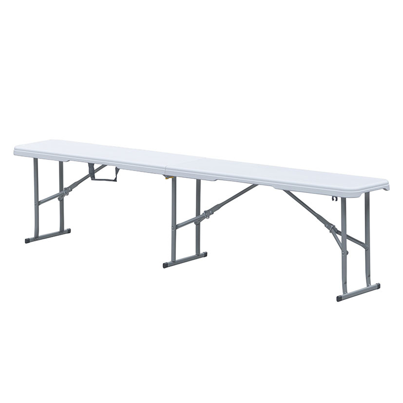 Tiene una estructura de acero que lo hace resistente y fuerte. El material de la superficie con el que está fabricado es el polietileno blanco de alta densidad. Esto lo convierte en un banco ideal tanto para exteriores como para interiores. Incorpora un asa para poder ser transportado una vez plegado, ya que dispone de un plegado fácil que reduce su tamaño para poder llevarlo de un lugar a otro. Se presenta en una caja.