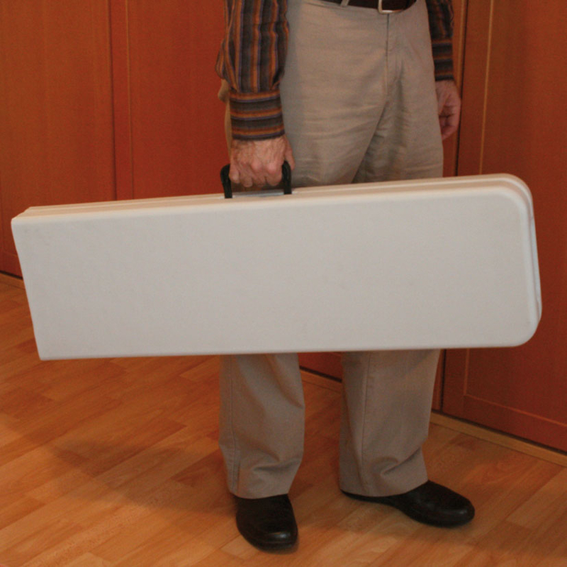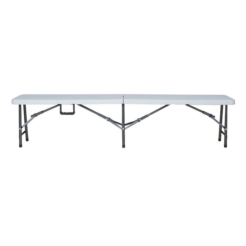 Tiene una estructura de acero que lo hace resistente y fuerte. El material de la superficie con el que está fabricado es el polietileno blanco de alta densidad. Esto lo convierte en un banco ideal tanto para exteriores como para interiores. Incorpora un asa para poder ser transportado una vez plegado, ya que dispone de un plegado fácil que reduce su tamaño para poder llevarlo de un lugar a otro. Se presenta en una caja.
