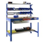 Banco de trabajo sin tornillos con bandejas de madera, 3 baldas reclinables y un cajón para guardar herramientas. Es de color AZUL/MADERA.Tiene 5 estantes. Las dimensiones de esta Estantería son: 1445x1210x610 mm. Y tiene una capacidad de carga de 600 kgs el estante principal, 250 kgs el estante inferior y 25 kgs aguanta cada balda reclinable. El cajón aguanta hasta 35 kgs. Es fabricado en España y se monta rápido siguiendo las instrucciones.