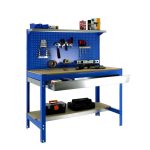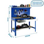 Banco de trabajo sin tornillos con bandejas de madera. Incluye repisa superior, cajón y panel perforado para guardar herramientas y cuyo montaje sí que lleva tornillos. Es de color AZUL/MADERA.Tiene 3 estantes. Las dimensiones de esta Estantería son: 1445x1210x610 mm. Y tiene una capacidad de carga de 600 kgs el estante principal y 250 kgs el estante inferior. La repisa superior aguanta hasta 25 kgs y el cajón 35 kgs. Es fabricado en España y se monta rápido siguiendo las instrucciones.