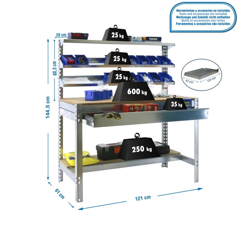 Banco de trabajo sin tornillos con bandejas de madera, 3 baldas reclinables y un cajón para guardar herramientas. Es de color GALVA/MADERA.Tiene 5 estantes. Las dimensiones de esta Estantería son: 1445x1210x610 mm. Y tiene una capacidad de carga de 600 kgs el estante principal, 250 kgs el estante inferior y 25 kgs aguanta cada balda reclinable. El cajón aguanta hasta 35 kgs. Es fabricado en España y se monta rápido siguiendo las instrucciones.