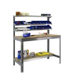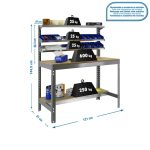 Banco de trabajo sin tornillos con bandejas de madera y 3 baldas reclinables. Es de color GRIS/MADERA.Tiene 5 estantes. Las dimensiones de esta Estantería son: 1445x1210x610 mm. Y tiene una capacidad de carga de 600 kgs el estante principal, 250 kgs el estante inferior y 25 kgs aguanta cada balda reclinable. Es fabricado en España y se monta rápido siguiendo las instrucciones.