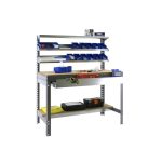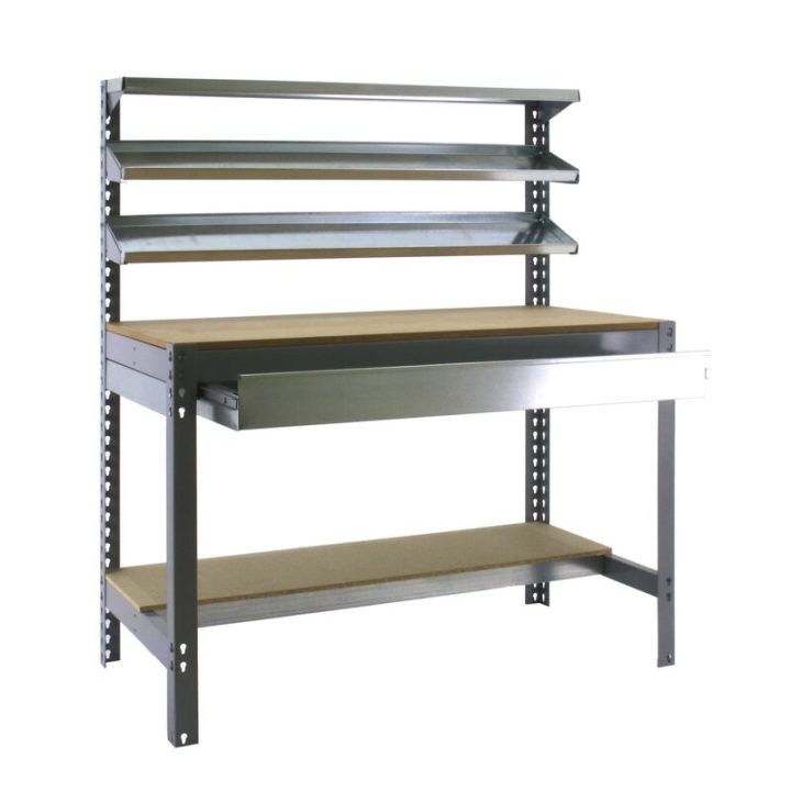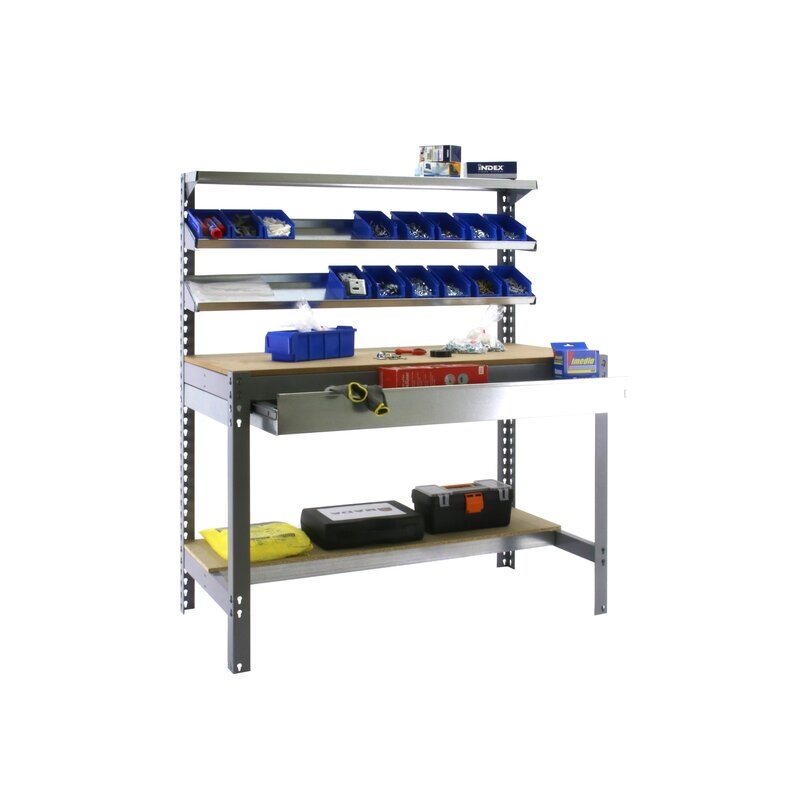 Banco de trabajo sin tornillos con bandejas de madera, 3 baldas reclinables y un cajón para guardar herramientas. Es de color GRIS/MADERA.Tiene 5 estantes. Las dimensiones de esta Estantería son: 1445x1210x610 mm. Y tiene una capacidad de carga de 600 kgs el estante principal, 250 kgs el estante inferior y 25 kgs aguanta cada balda reclinable. El cajón aguanta hasta 35 kgs. Es fabricado en España y se monta rápido siguiendo las instrucciones.