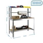 Banco de trabajo sin tornillos con bandejas de madera. Incluye repisa superior (montaje con tornillos) y larguero cuelga rollos. Es de color GALVA/MADERA.Tiene 3 estantes. Las dimensiones de esta Estantería son: 1445x1210x760 mm. Y tiene una capacidad de carga de 600 kgs el estante principal y 250 kgs el estante inferior. La repisa superior aguanta hasta 25 kgs. Es fabricado en España y se monta rápido siguiendo las instrucciones.