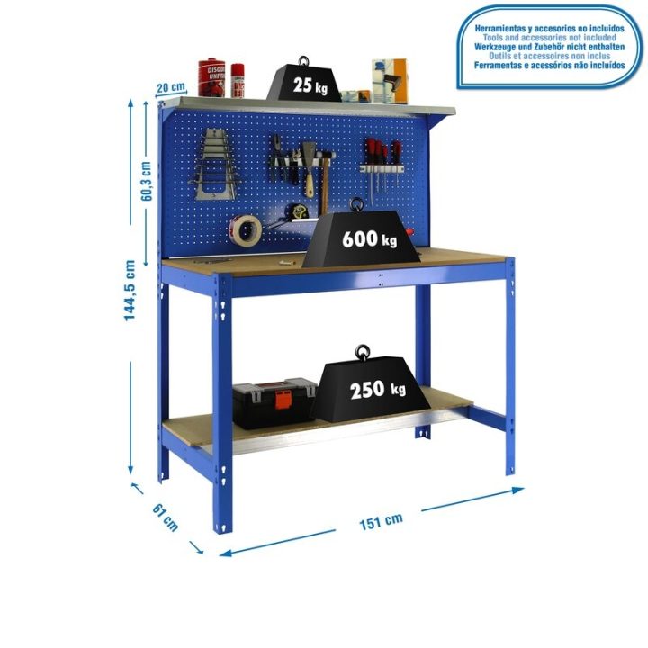 Banco de trabajo sin tornillos con bandejas de madera. Incluye repisa superior y panel perforado también para guardar herramientas y cuyo montaje sí que lleva tornillos. Es de color AZUL/MADERA.Tiene 3 estantes. Las dimensiones de esta Estantería son: 1445x1510x610 mm. Y tiene una capacidad de carga de 600 kgs el estante principal y 250 kgs el estante inferior. La repisa superior aguanta hasta 25 kgs. Es fabricado en España y se monta rápido siguiendo las instrucciones.