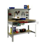 Banco de trabajo sin tornillos con bandejas de madera. Incluye repisa superior, cajón y panel perforado para guardar herramientas y cuyo montaje sí que lleva tornillos. Es de color GALVA/MADERA.Tiene 3 estantes. Las dimensiones de esta Estantería son: 1445x1510x610 mm. Y tiene una capacidad de carga de 600 kgs el estante principal y 250 kgs el estante inferior. La repisa superior aguanta hasta 25 kgs y el cajón 35 kgs. Es fabricado en España y se monta rápido siguiendo las instrucciones.