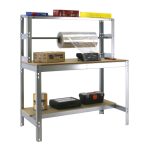 Banco de trabajo sin tornillos con bandejas de madera. Incluye repisa superior (montaje con tornillos) y larguero cuelga rollos. Es de color GALVA/MADERA.Tiene 3 estantes. Las dimensiones de esta Estantería son: 1445x1510x760 mm. Y tiene una capacidad de carga de 600 kgs el estante principal y 250 kgs el estante inferior. La repisa superior aguanta hasta 25 kgs. Es fabricado en España y se monta rápido siguiendo las instrucciones.