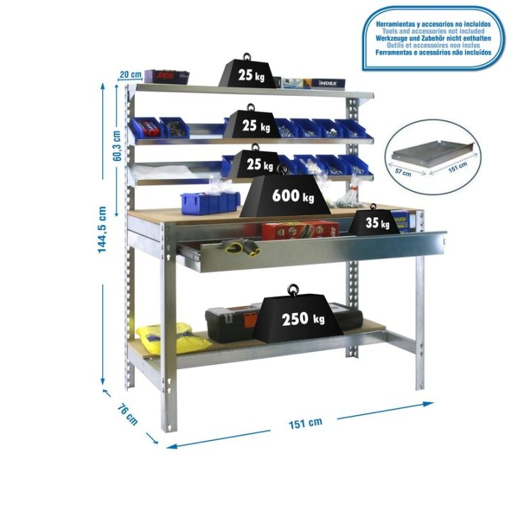 Banco de trabajo sin tornillos con bandejas de madera, 3 baldas reclinables y un cajón para guardar herramientas. Es de color GALVA/MADERA.Tiene 5 estantes. Las dimensiones de esta Estantería son: 1445x1510x760 mm. Y tiene una capacidad de carga de 600 kgs el estante principal, 250 kgs el estante inferior y 25 kgs aguanta cada balda reclinable. El cajón aguanta hasta 35 kgs. Es fabricado en España y se monta rápido siguiendo las instrucciones.