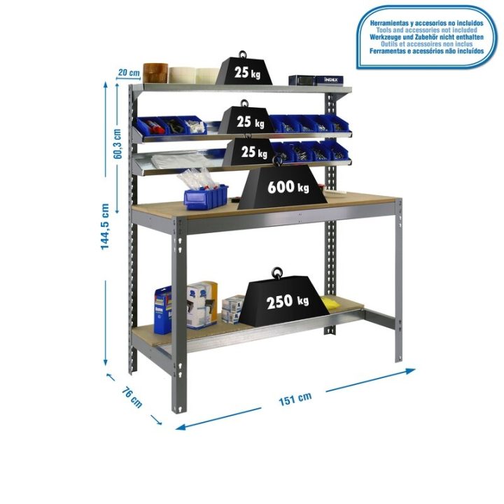 Banco de trabajo sin tornillos con bandejas de madera y 3 baldas reclinables. Es de color GRIS/MADERA.Tiene 5 estantes. Las dimensiones de esta Estantería son: 1445x1510x760 mm. Y tiene una capacidad de carga de 600 kgs el estante principal, 250 kgs el estante inferior y 25 kgs aguanta cada balda reclinable. Es fabricado en España y se monta rápido siguiendo las instrucciones.