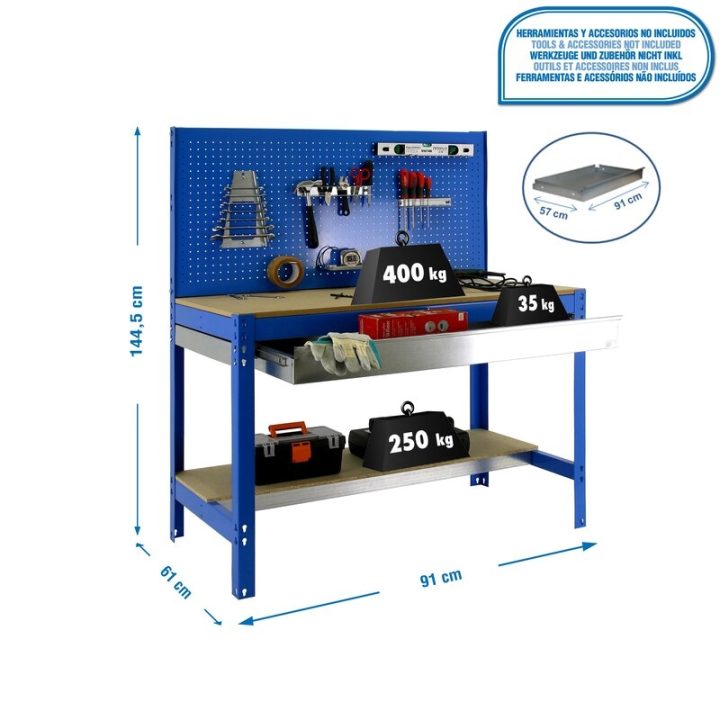 Banco de trabajo sin tornillos con bandejas de madera y cajón para almacenar herramientas. Incluye panel perforado también para guardar herramientas y cuyo montaje sí que lleva tornillos. Es de color AZUL/MADERA.Tiene 2 estantes. Las dimensiones de esta Estantería son: 1445x910x610 mm. Y tiene una capacidad de carga de 400 kgs el estante principal y 250 kgs el estante inferior. El cajón aguanta hasta 35 kgs. Es fabricado en España y se monta rápido siguiendo las instrucciones.