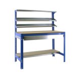 Banco de trabajo sin tornillos con bandejas de madera, 3 baldas reclinables y un cajón para guardar herramientas. Es de color AZUL/MADERA.Tiene 5 estantes. Las dimensiones de esta Estantería son: 1445x910x610 mm. Y tiene una capacidad de carga de 400 kgs el estante principal, 250 kgs el estante inferior y 25 kgs aguanta cada balda reclinable. El cajón aguanta hasta 35 kgs. Es fabricado en España y se monta rápido siguiendo las instrucciones.