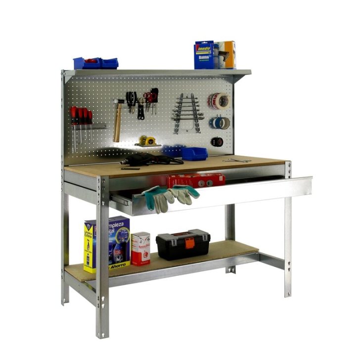 Banco de trabajo sin tornillos con bandejas de madera. Incluye repisa superior, cajón y panel perforado para guardar herramientas y cuyo montaje sí que lleva tornillos. Es de color GALVA/MADERA.Tiene 3 estantes. Las dimensiones de esta Estantería son: 1445x910x610 mm. Y tiene una capacidad de carga de 400 kgs el estante principal y 250 kgs el estante inferior. La repisa superior aguanta hasta 25 kgs y el cajón 35 kgs. Es fabricado en España y se monta rápido siguiendo las instrucciones.