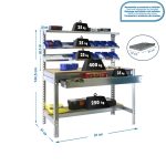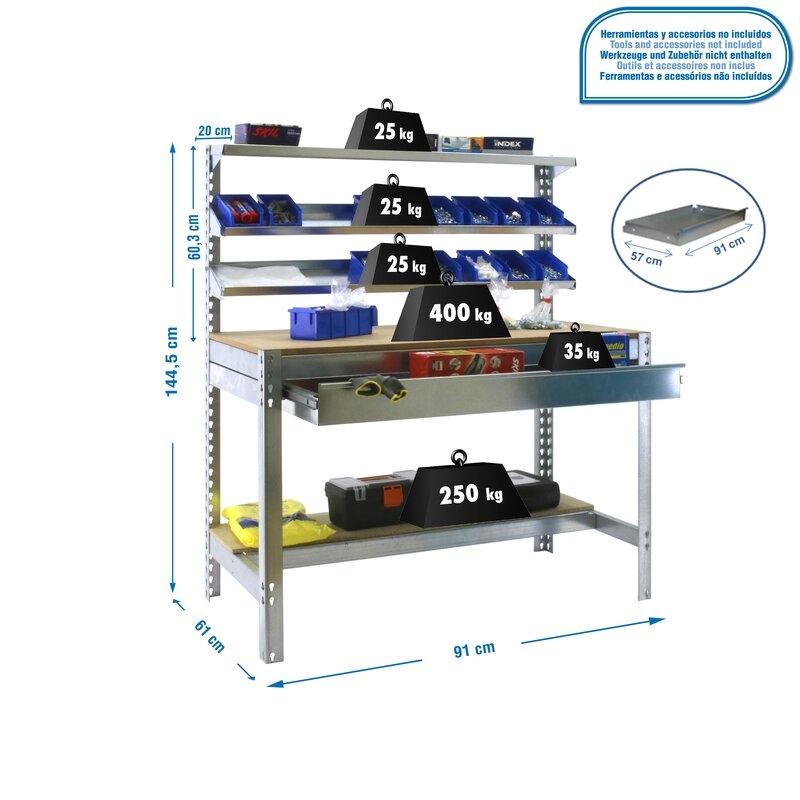Banco de trabajo sin tornillos con bandejas de madera, 3 baldas reclinables y un cajón para guardar herramientas. Es de color GALVA/MADERA.Tiene 5 estantes. Las dimensiones de esta Estantería son: 1445x910x610 mm. Y tiene una capacidad de carga de 400 kgs el estante principal, 250 kgs el estante inferior y 25 kgs aguanta cada balda reclinable. El cajón aguanta hasta 35 kgs. Es fabricado en España y se monta rápido siguiendo las instrucciones.