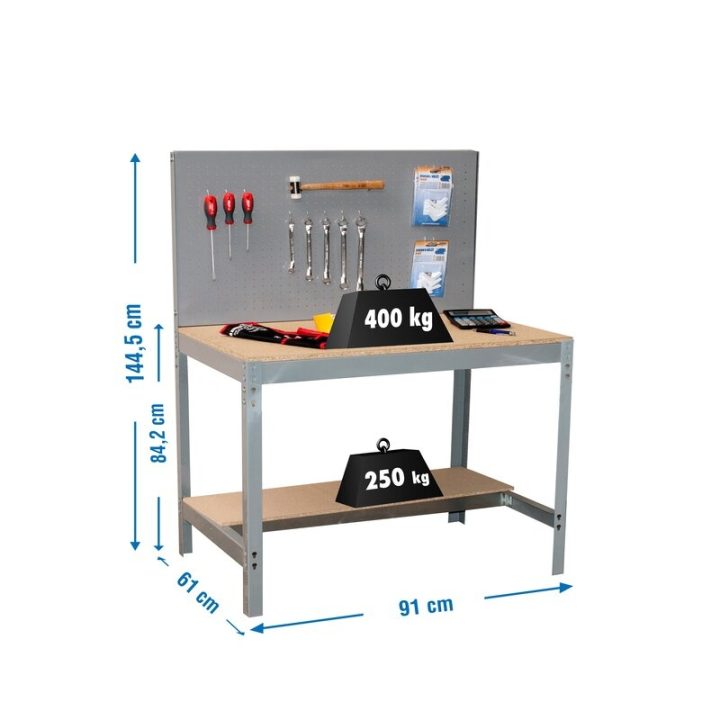 Banco de trabajo sin tornillos con bandejas de madera. Incluye panel perforado para guardar herramientas y cuyo montaje sí que lleva tornillos. Es de color GRIS/MADERA.Tiene 2 estantes. Las dimensiones de esta Estantería son: 1445x910x610 mm. Y tiene una capacidad de carga de 400 kgs el estante principal y 250 kgs el estante inferior. Es fabricado en España y se monta rápido siguiendo las instrucciones.