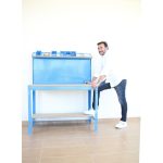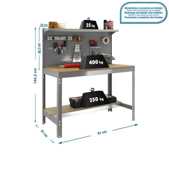 Banco de trabajo sin tornillos con bandejas de madera. Incluye repisa superior y panel perforado también para guardar herramientas y cuyo montaje sí que lleva tornillos. Es de color GRIS/MADERA.Tiene 3 estantes. Las dimensiones de esta Estantería son: 1445x910x610 mm. Y tiene una capacidad de carga de 400 kgs el estante principal y 250 kgs el estante inferior. La repisa superior aguanta hasta 25 kgs. Es fabricado en España y se monta rápido siguiendo las instrucciones.