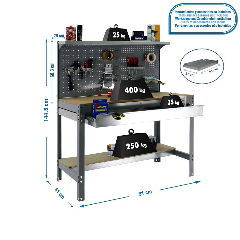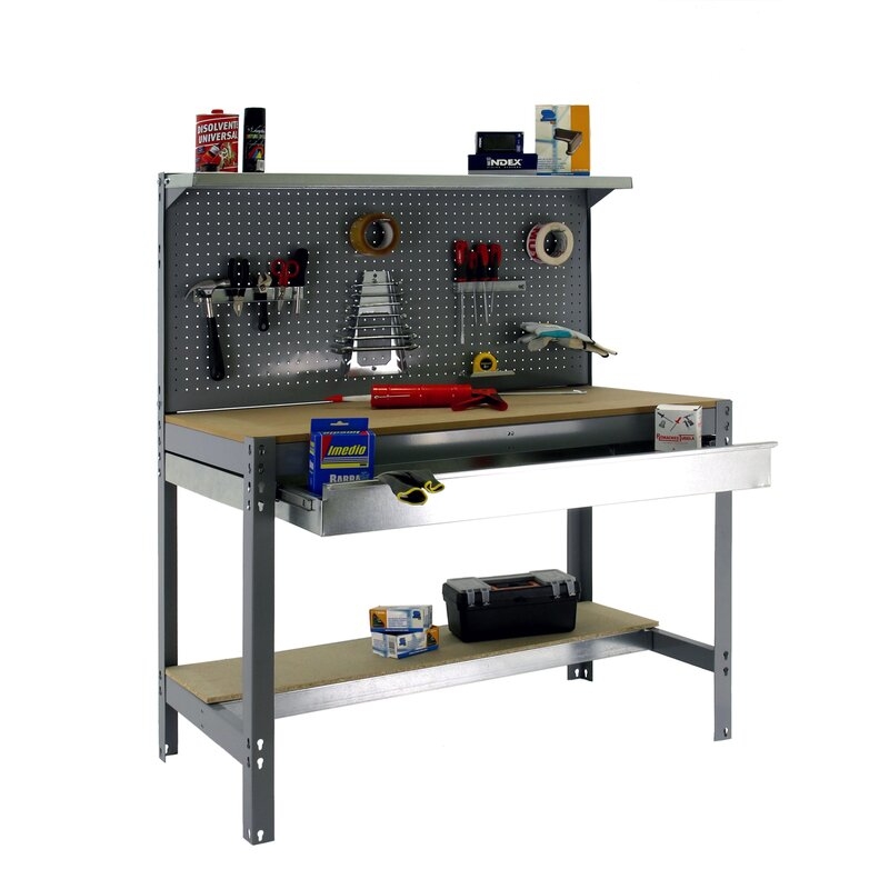 Banco de trabajo sin tornillos con bandejas de madera. Incluye repisa superior, cajón y panel perforado para guardar herramientas y cuyo montaje sí que lleva tornillos. Es de color GRIS/MADERA.Tiene 3 estantes. Las dimensiones de esta Estantería son: 1445x910x610 mm. Y tiene una capacidad de carga de 400 kgs el estante principal y 250 kgs el estante inferior. La repisa superior aguanta hasta 25 kgs y el cajón 35 kgs. Es fabricado en España y se monta rápido siguiendo las instrucciones.