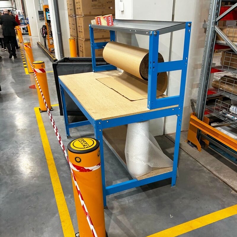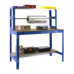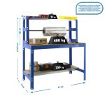 Banco de trabajo sin tornillos con bandejas de madera. Incluye repisa superior (montaje con tornillos) y larguero cuelga rollos. Es de color AZUL/MADERA.Tiene 3 estantes. Las dimensiones de esta Estantería son: 1445x910x760 mm. Y tiene una capacidad de carga de 400 kgs el estante principal y 250 kgs el estante inferior. La repisa superior aguanta hasta 25 kgs. Es fabricado en España y se monta rápido siguiendo las instrucciones.