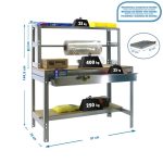 Banco de trabajo sin tornillos con bandejas de madera. Incluye repisa superior (montaje con tornillos), cajón y larguero cuelga rollos. Es de color GALVA/MADERA.Tiene 3 estantes. Las dimensiones de esta Estantería son: 1445x910x760 mm. Y tiene una capacidad de carga de 400 kgs el estante principal y 250 kgs el estante inferior. La repisa superior aguanta hasta 25 kgs y el cajón 35 kgs. Es fabricado en España y se monta rápido siguiendo las instrucciones.
