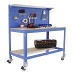Banco de trabajo sin tornillos con bandejas de madera. Incluye ruedas. Incluye repisa superior y panel perforado también para guardar herramientas y cuyo montaje sí que lleva tornillos. Es de color AZUL/MADERA.Tiene 3 estantes. Las dimensiones de esta Estantería son: 1555x1210x610 mm. Y tiene una capacidad de carga total de 120 kgs al llevar ruedas. Es fabricado en España y se monta rápido siguiendo las instrucciones.