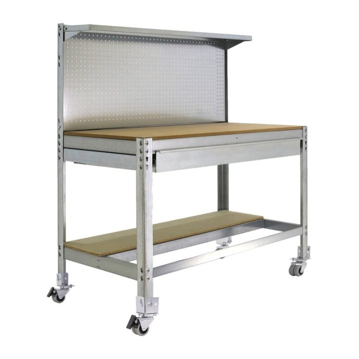 Banco de trabajo sin tornillos con bandejas de madera. Incluye ruedas. Incluye repisa superior, cajón y panel perforado para guardar herramientas y cuyo montaje sí que lleva tornillos. Es de color GALVA/MADERA.Tiene 3 estantes. Las dimensiones de esta Estantería son: 1555x1210x610 mm. Y tiene una capacidad de carga total de 120 kgs al llevar ruedas. Es fabricado en España y se monta rápido siguiendo las instrucciones.