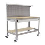 Banco de trabajo sin tornillos con bandejas de madera. Incluye ruedas. Incluye repisa superior, cajón y panel perforado para guardar herramientas y cuyo montaje sí que lleva tornillos. Es de color GRIS/MADERA.Tiene 3 estantes. Las dimensiones de esta Estantería son: 1555x1210x610 mm. Y tiene una capacidad de carga total de 120 kgs al llevar ruedas. Es fabricado en España y se monta rápido siguiendo las instrucciones.
