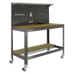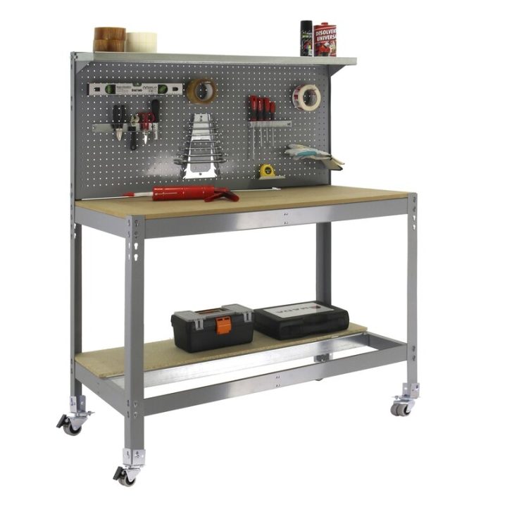 Banco de trabajo sin tornillos con bandejas de madera. Incluye ruedas. Incluye repisa superior y panel perforado también para guardar herramientas y cuyo montaje sí que lleva tornillos. Es de color GRIS/MADERA.Tiene 3 estantes. Las dimensiones de esta Estantería son: 1555x1210x610 mm. Y tiene una capacidad de carga total de 120 kgs al llevar ruedas. Es fabricado en España y se monta rápido siguiendo las instrucciones.