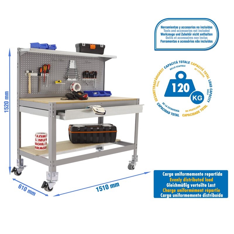 Banco de trabajo sin tornillos con bandejas de madera. Incluye ruedas. Incluye repisa superior, cajón y panel perforado para guardar herramientas y cuyo montaje sí que lleva tornillos. Es de color GRIS/MADERA.Tiene 3 estantes. Las dimensiones de esta Estantería son: 1555x1510x610 mm. Y tiene una capacidad de carga total de 120 kgs al llevar ruedas. Es fabricado en España y se monta rápido siguiendo las instrucciones.