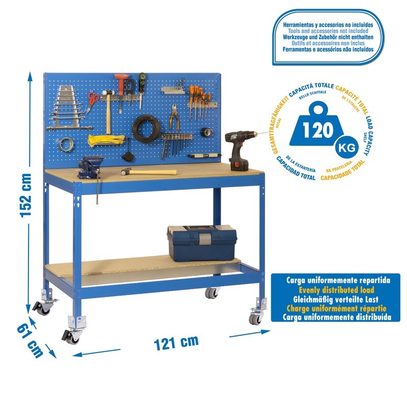 Banco de trabajo sin tornillos con bandejas de madera. Incluye ruedas. Incluye panel perforado para guardar herramientas y cuyo montaje sí que lleva tornillos. Es de color AZUL/MADERA.Tiene 2 estantes. Las dimensiones de esta Estantería son: 1560x1210x610 mm. Y tiene una capacidad de carga total de 120 kgs al llevar ruedas. Es fabricado en España y se monta rápido siguiendo las instrucciones.