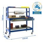 Banco de trabajo sin tornillos con bandejas de madera. Incluye ruedas. Incluye repisa superior (montaje con tornillos), cajón y larguero cuelga rollos. Es de color AZUL/MADERA.Tiene 3 estantes. Las dimensiones de esta Estantería son: 1560x1210x760 mm. Y tiene una capacidad de carga total de 120 kgs al llevar ruedas. Es fabricado en España y se monta rápido siguiendo las instrucciones.