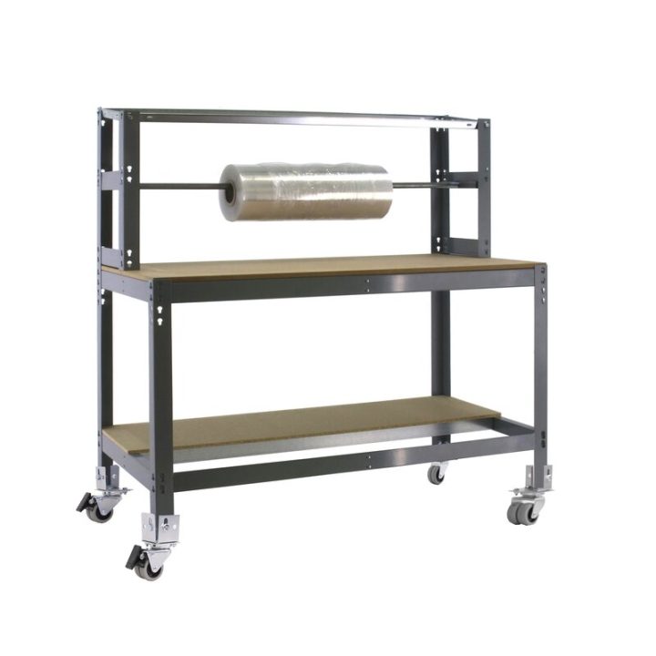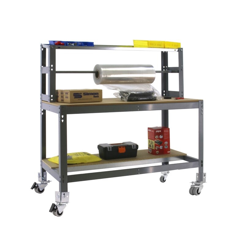 Banco de trabajo sin tornillos con bandejas de madera. Incluye ruedas. Incluye repisa superior (montaje con tornillos) y larguero cuelga rollos. Es de color GRIS/MADERA.Tiene 3 estantes. Las dimensiones de esta Estantería son: 1560x1210x760 mm. Y tiene una capacidad de carga total de 120 kgs al llevar ruedas. Es fabricado en España y se monta rápido siguiendo las instrucciones.